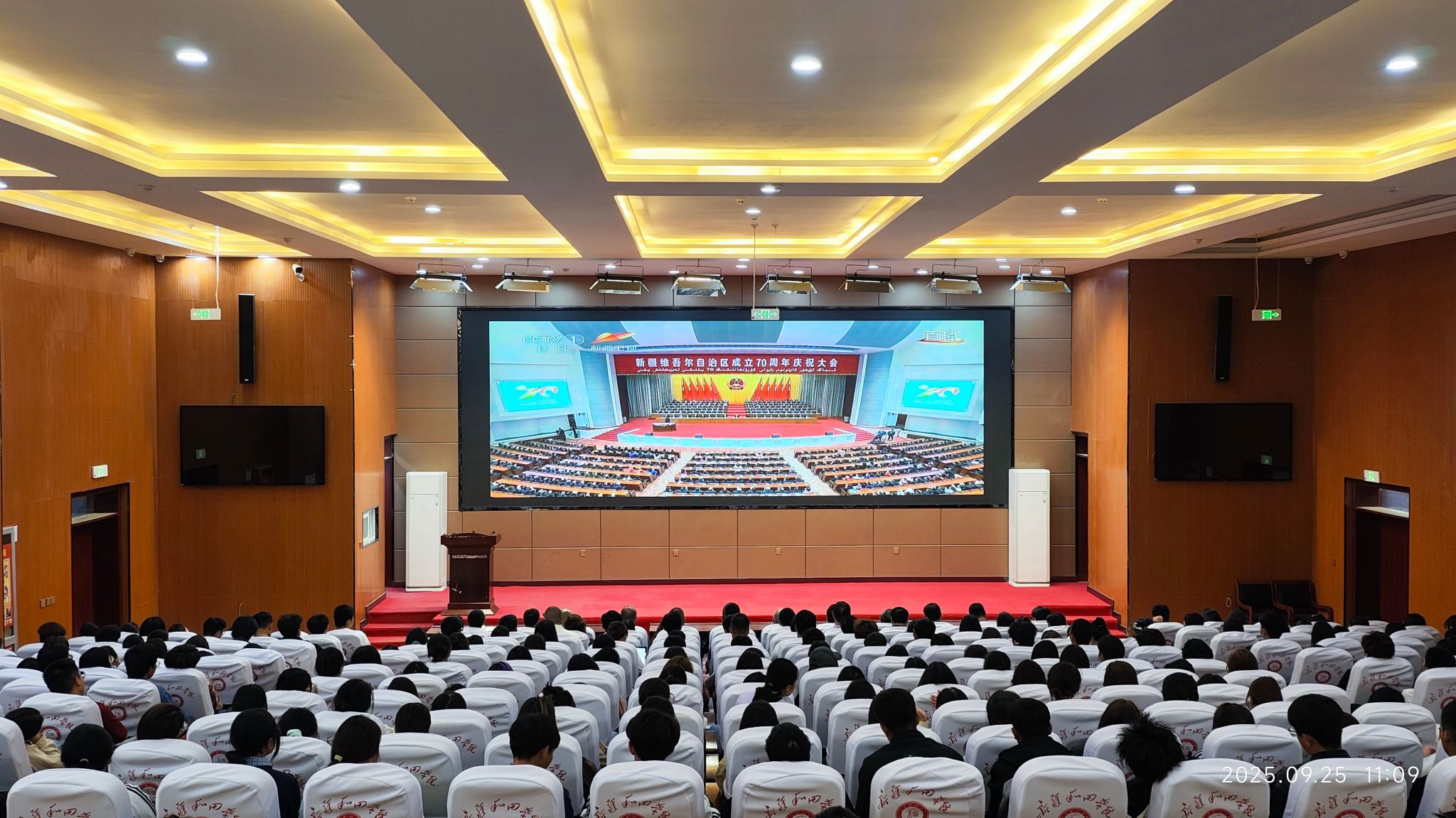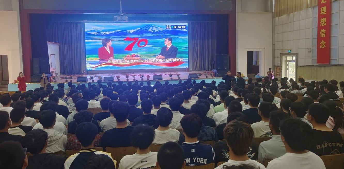 砥砺奋进七十载 天山南北谱华章。2025年9月25日上午10时30分,新疆维吾尔自治区成立70周年庆祝大会在首府乌鲁木齐隆重举行,万众欢腾,举世瞩目。大会全面回顾了自治区70年来取得的辉煌成就,生动展示了在以习近平同志为核心的党中央领导下,新疆各族人民团结奋斗、繁荣发展的壮美画卷。新疆和田学院学工团队,学生会成员,新和院“一校三区”6000余名新生怀着无比激动和自豪的心情,通过直播共同收看了这一具有里程碑意义的庆典盛况。这场庆典不仅是一次“隆重集会”,更是一堂深刻的“大思政课”,让与会师生深受震撼,倍感振奋,更为引航新生开启大学征程奠定了坚实的基础。