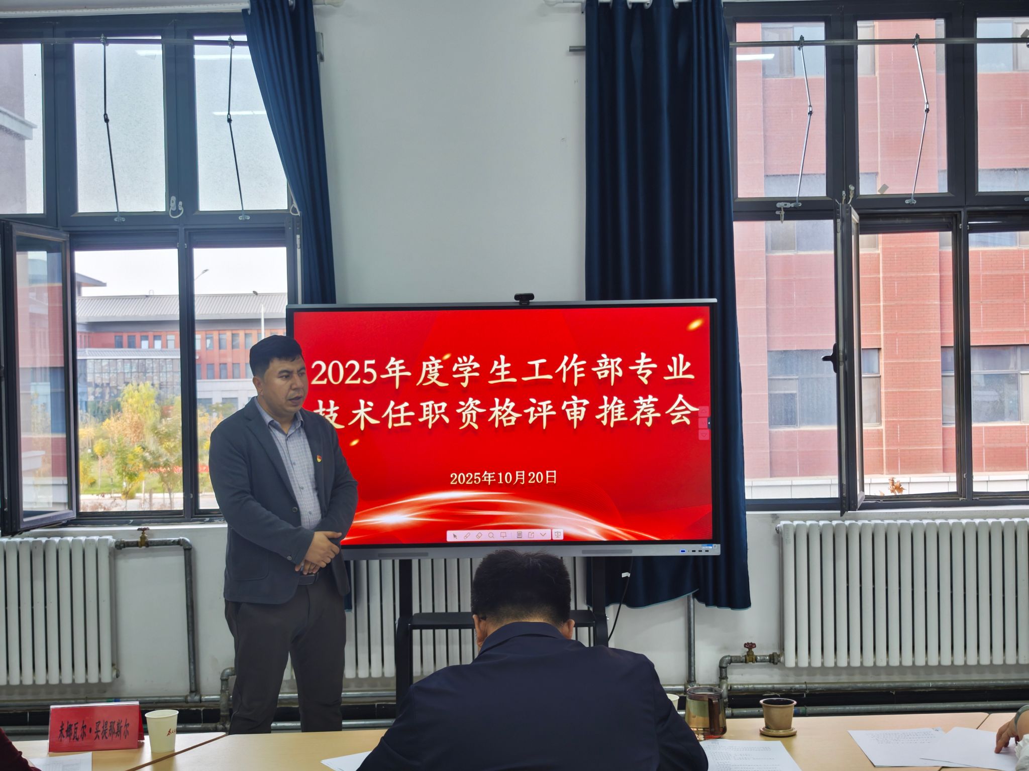 为贯彻落实学校关于职称评审工作的部署安排,依据《关于开展新疆和田学院2025年度专业技术职务评审工作的通知》要求,10月20日下午,学生工作部在昆仑路校区学生一站式社区大厅召开2025年度辅导员专业技术职称评审推荐会。