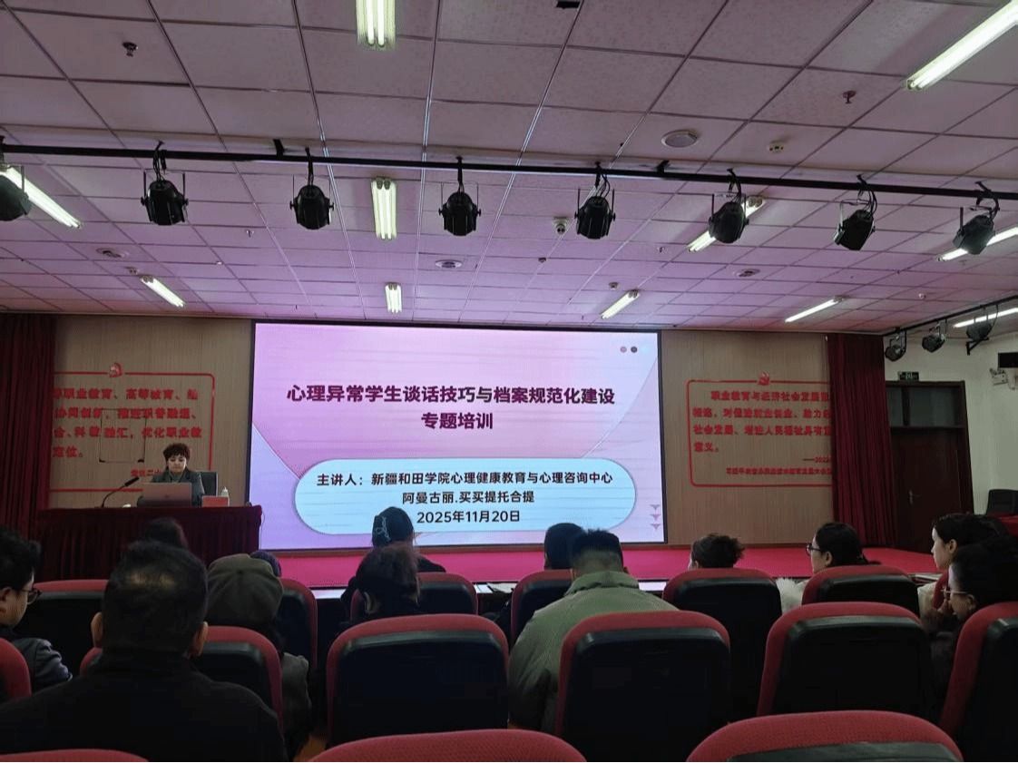 为切实提升班主任对学生心理问题的识别、干预与疏导能力,本次活动同步开展班主任专项培训,和田技师学院全体班主任全程参与。培训围绕 “心理异常学生谈话技巧”“档案规范化建设” 两大核心模块展开,兼具理论深度与实践指导性。