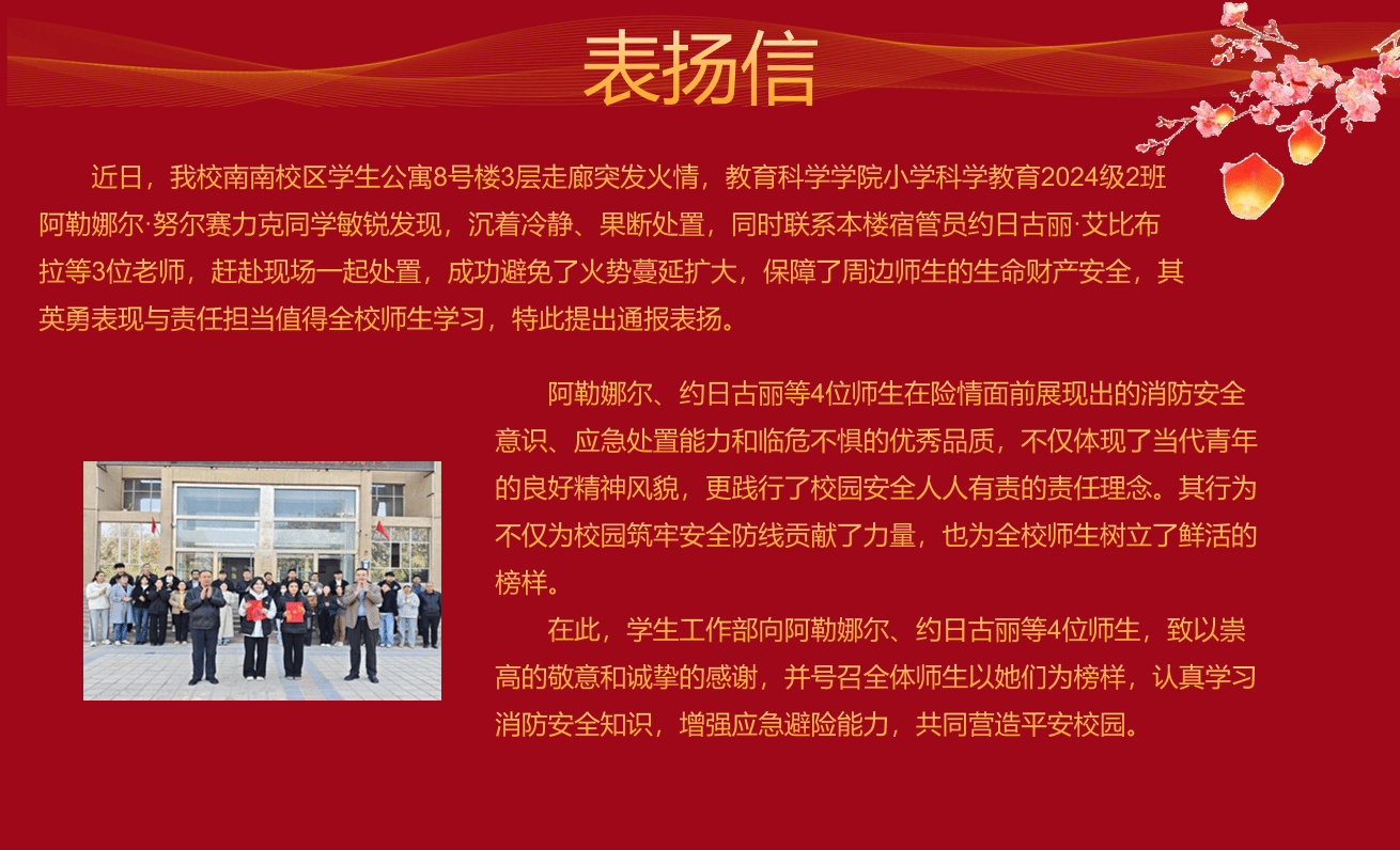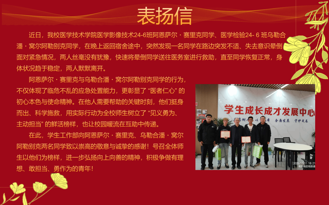 近期,我校先后涌现出阿勒娜尔·努尔赛力克、阿恩萨尔·赛里克、乌勒合潘·窝尔阿勒别克等先进典型,他们用实际行动践行社会主义核心价值观,诠释新时代大学生“向上向善、知行合一”的精神风貌,为校园文化建设注入了温暖而坚定的青春力量。为表彰先进、弘扬正气,经学生工作部研究决定,对上述先进典型予以通报表扬。希望受到表彰的同学再接再厉,继续发挥模范带头作用;同时也希望更多的同学向他们学习,以主人翁的责任感参与到学校事业发展建设中,共同营造团结和谐、安全稳定的校园环境。