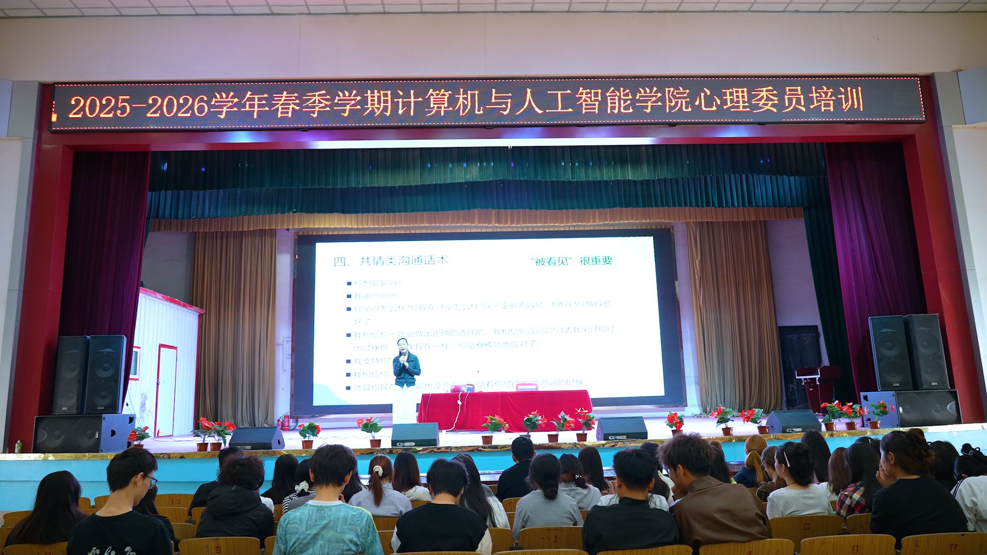 为进一步加强二级学院心理健康教育工作,提升班级心理委员的专业素养与工作能力,充分发挥其在学生心理健康服务中的“前沿哨兵”作用,4月1日,学生心理健康教育与咨询中心教师受邀在南校区大礼堂为计算机与人工智能学院开展心理委员专题培训。学院心理健康工作负责人、全体班级心理委员参加本次培训。